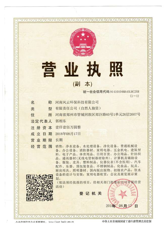河南風云環(huán)??萍加邢薰?河南浩美環(huán)保科技有限公司隸屬佛山市美的清湖凈水設備有限公司,河南風云環(huán)??萍加邢薰境闪⒂?016年12月,注冊資金1000萬元。公司主要從事美的集團名下的凈水器,專注凈水行業十多年,是集研發(fā)、生產、銷售、服務一體的企業。